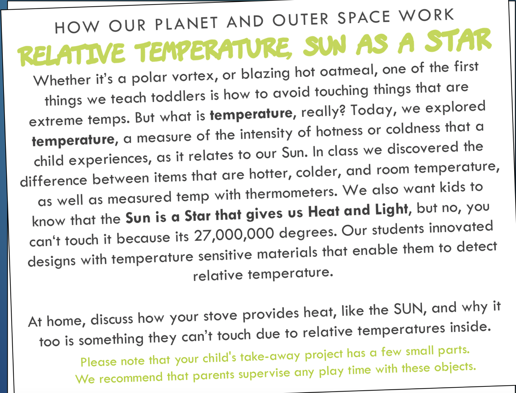 During our summer camps this year in Seattle, students had a blast discussing and playing with temperature changes. They had the chance to experiment with heat and light as well as explore the relative temperatures of various objects. Our summer camp students were then were able to design a heat sensing tool as seen above. The purpose of these tools is to relay information of relative temperature and UV light from the sun. In order to do this they were given the KSL relative temperature scale seen below.