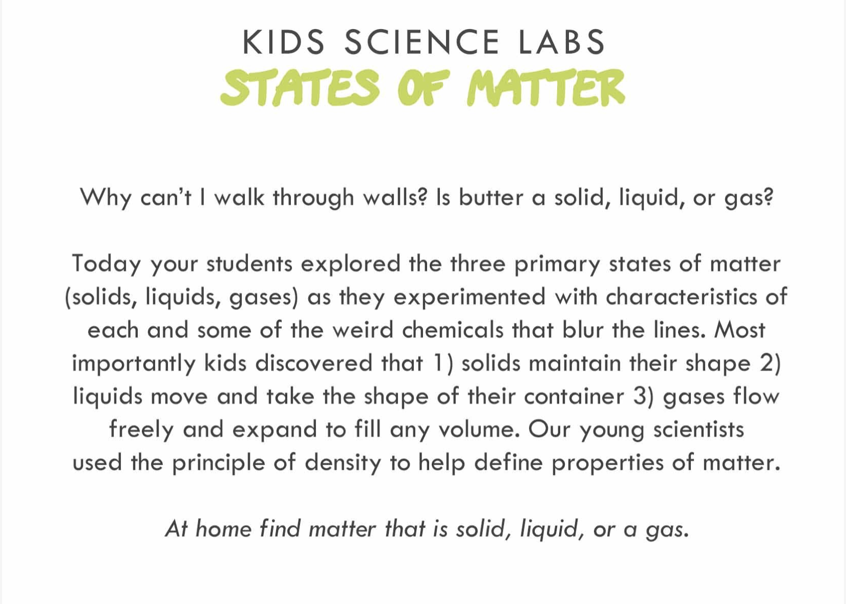 Our scholars at Kids Science Summer Camp in Chicago are focusing their problems solving science on discovering the basic chemistry and characteristics of the primary states of matter. What exactly distinguishes whether everyday objects are solids and liquids, and what chemistry can be deployed to change those characteristics or states of matter.